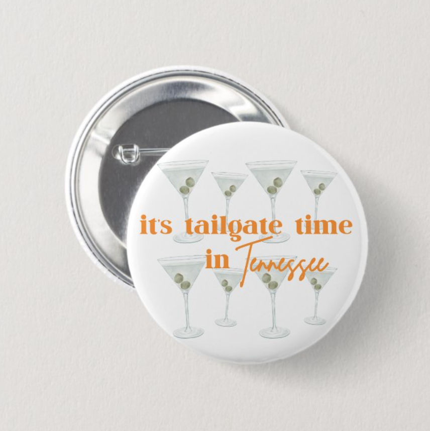 Raise a glass and rep your Vol spirit in style! This playful button features hand-painted martini glasses paired with bold orange script that reads, “it’s tailgate time in Tennessee.” A must-have for spirited Saturdays, southern brunches, and game day girls who like their tailgates shaken, not stirred.