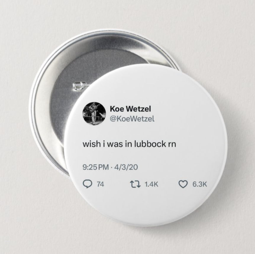 Wish I was in Lubbock rn Button - Koe Quote Series